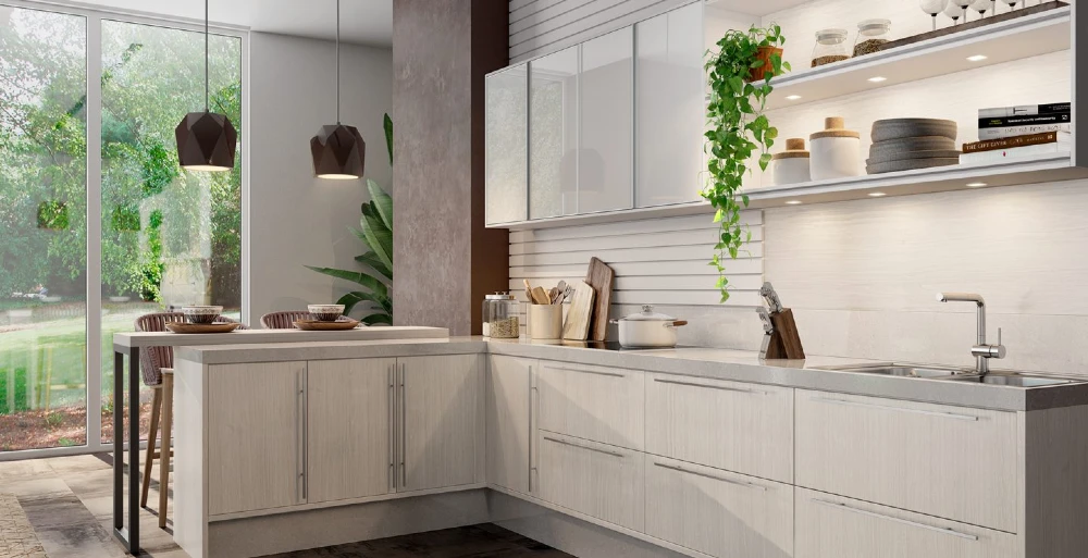 Típica de apartamentos pequenos, a bancada americana é um jeito de aproveitar o espaço na cozinha para fazer as refeições. No exemplo acima, a bancada foi criada na altura do armário lateral, com pés em serralheria – da nossa nova Linha Nero. Quando você não estiver usando, pode aproveitar a bancada para usar itens decorativos e dar um up na cozinha.