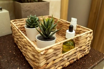 Perfeita para organizar cosméticos, colocar toalhinhas e até vasinhos de flor, a bandeja é uma ótima aliada na organização e decoração da pia do banheiro.