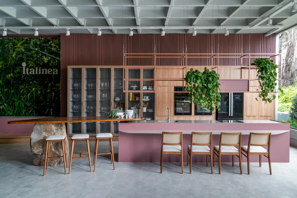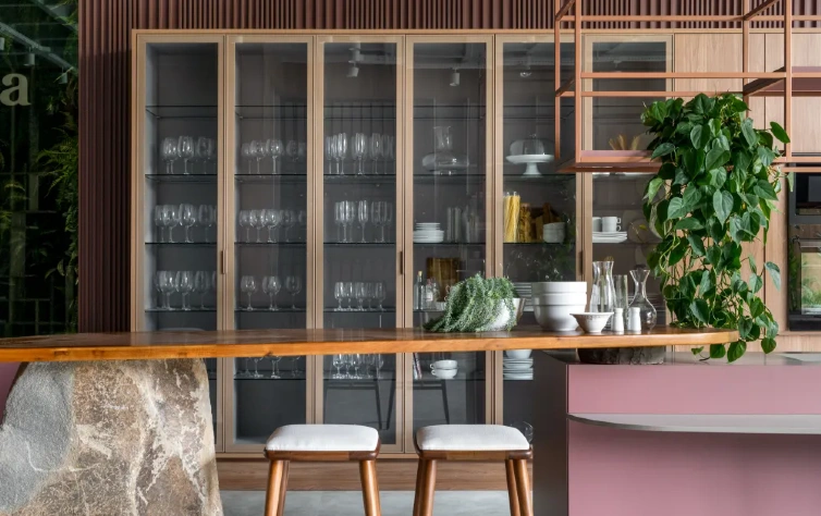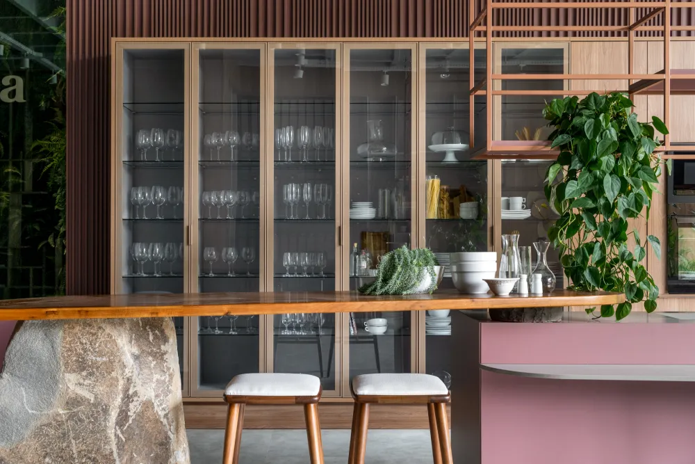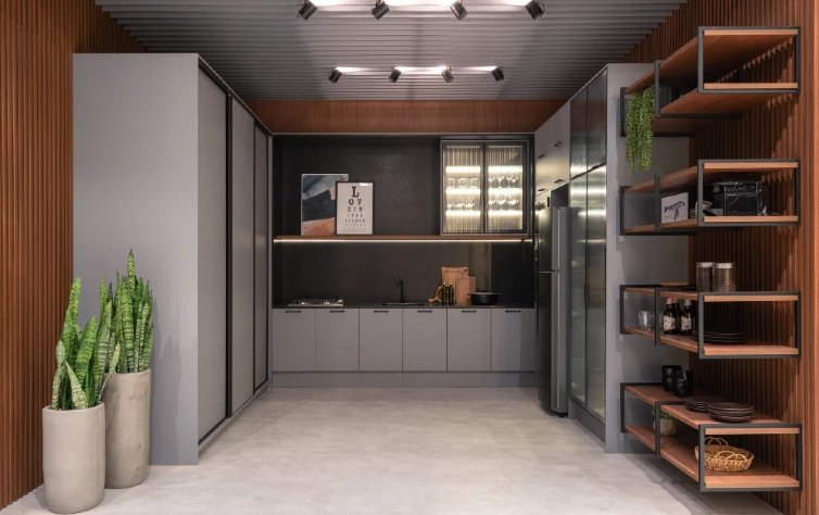 - Prateleiras abertas: permitem expor louças, utensílios decorativos e plantas, tornando o ambiente mais convidativo.