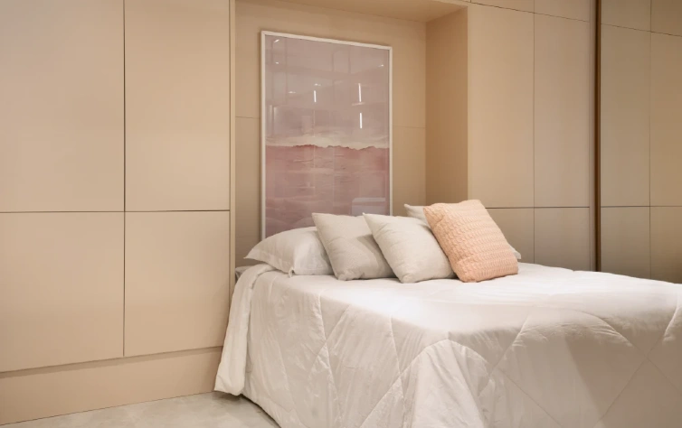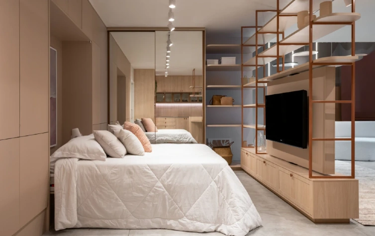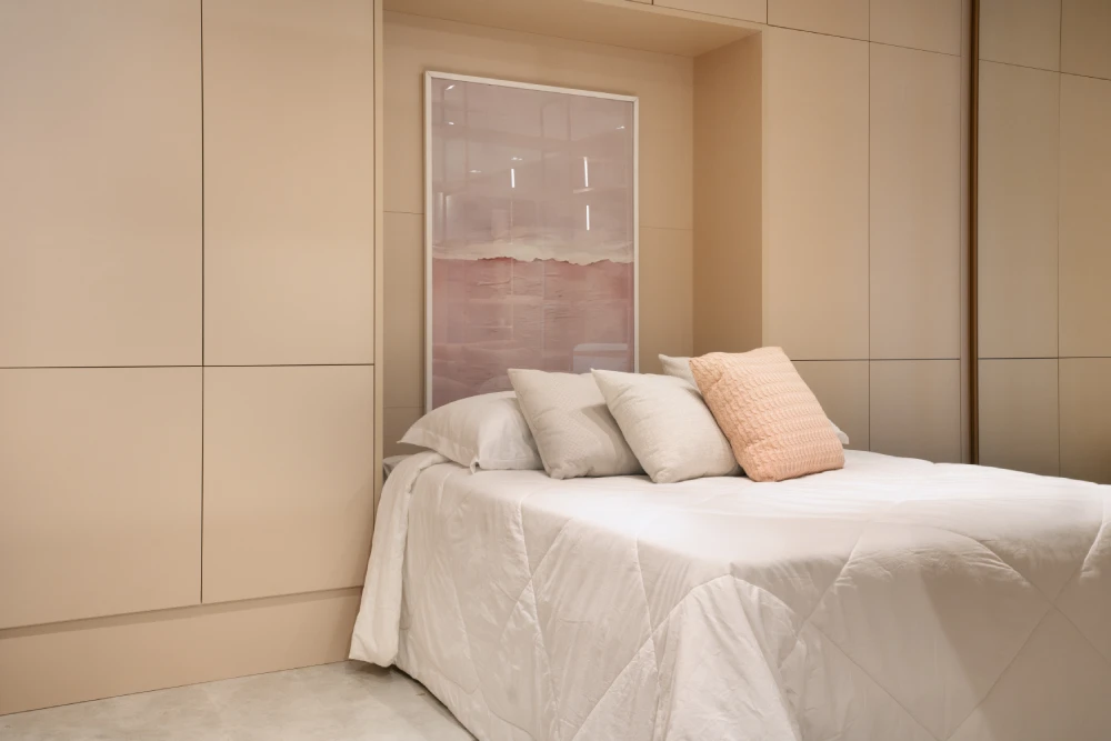 - Espaços multifuncionais: se você precisa de mais espaço para itens que não fazem parte do seu dia a dia, como malas, roupas de cama ou documentos, compartimentos ocultos ou nichos extras podem ser uma solução inteligente para manter seu quarto organizado.