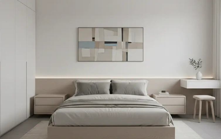 No estilo minimalista, o foco está na simplicidade funcional. O dormitório planejado é composto por poucos elementos, volumes limpos e superfícies contínuas, eliminando excessos visuais. Cada móvel tem uma função clara, o que facilita a organização e torna o ambiente mais fácil de manter no dia a dia. A paleta costuma ser neutra e uniforme, contribuindo para uma atmosfera calma, leve e propícia ao descanso.