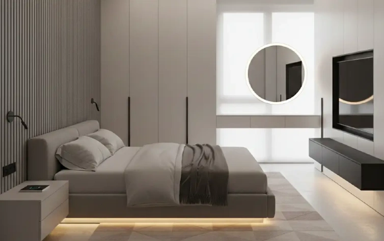O dormitório planejado moderno explora soluções contemporâneas, com superfícies lisas, linhas retas e integração entre mobiliário e iluminação. O uso de painéis, iluminação embutida e contrastes sutis entre materiais cria um ambiente sofisticado e funcional. Esse estilo prioriza fluidez visual e praticidade, sendo bastante comum em projetos que integram tecnologia de forma discreta ao mobiliário.